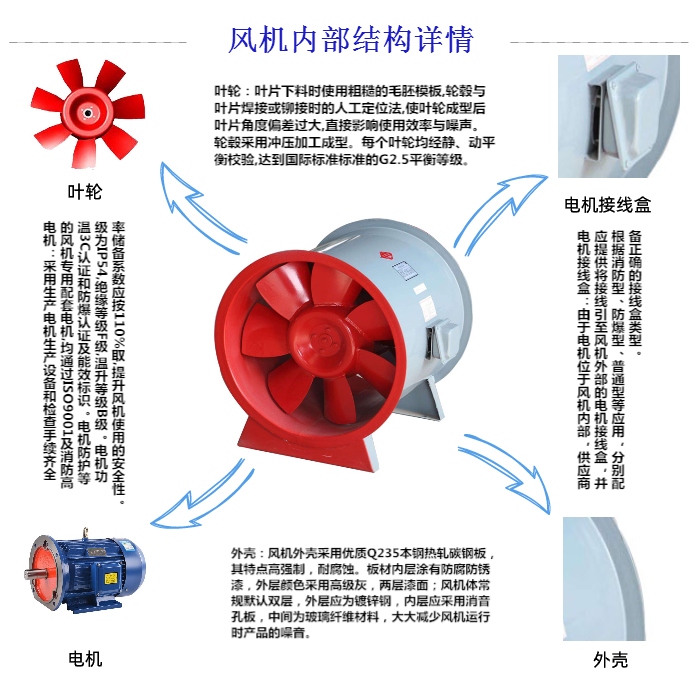 屋頂消防排煙風機選配附件:按需要可配設重力式止回風閥、防鳥(蟲)網、檢修開關、集中控制箱等附件。